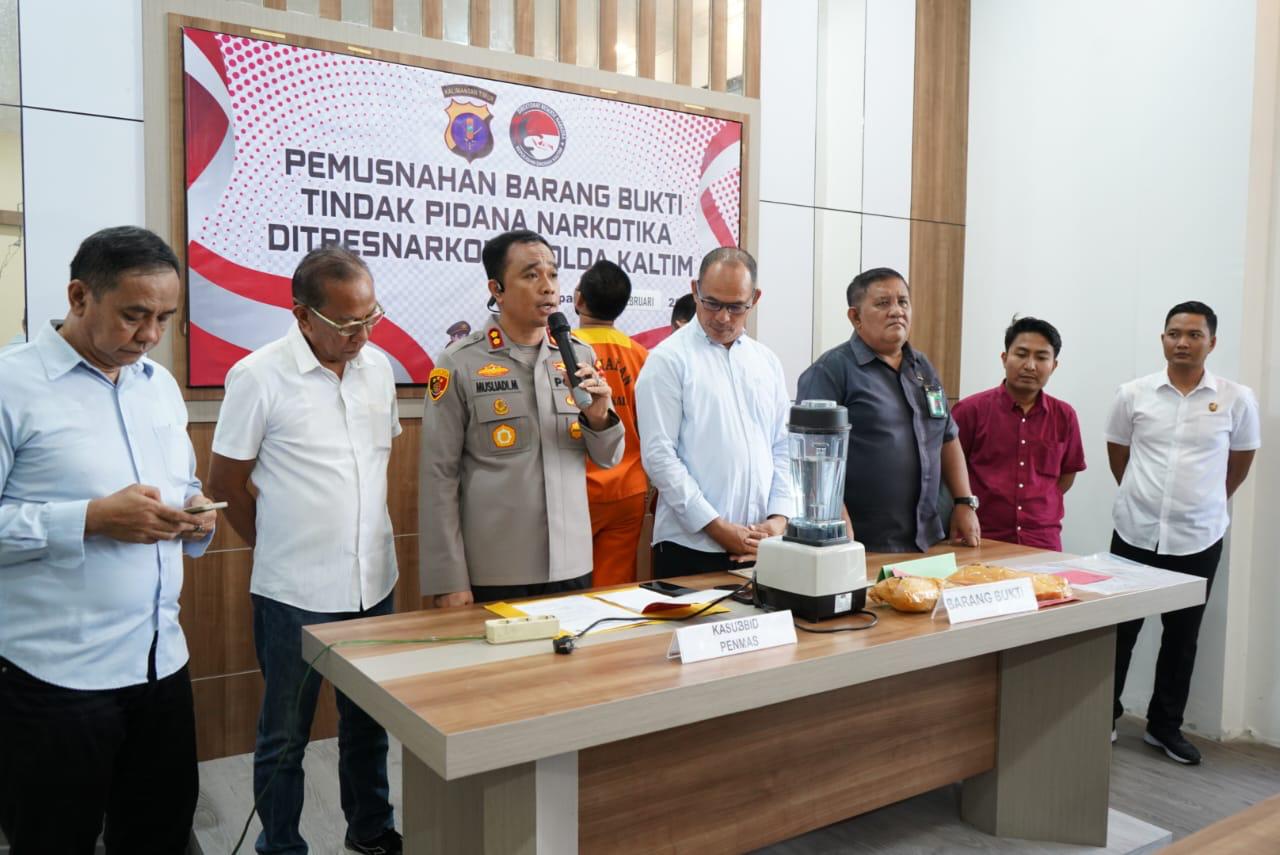 Lanjutnya, barang bukti tersebut dimusnahkan dengan cara bersama-sama diblender dan dilarutkan ke dalam air. Beberapa barang bukti lainnya disisihkan guna untuk proses uji Laboratorium BPOM Samarinda.