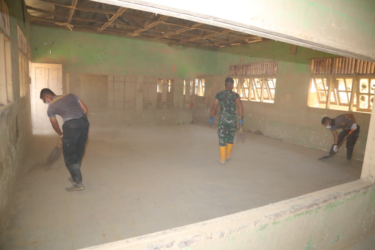 Dengan alat sederhana, para taruna bergotong royong mengangkat lumpur, menyapu lantai, hingga mengepel ruangan. Beberapa kelas mulai terlihat bersih dan kembali layak digunakan.