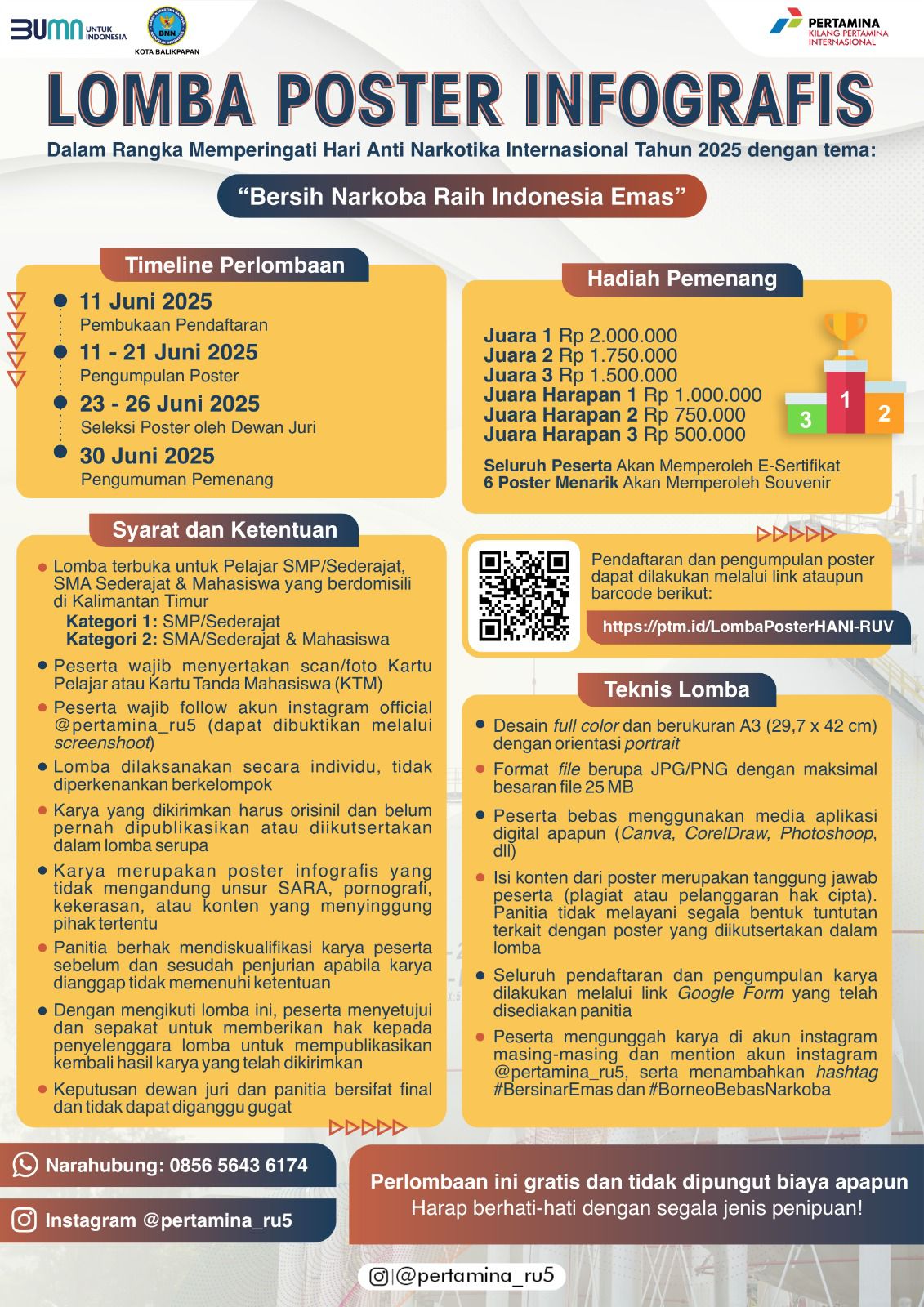 Untuk informasi lebih lanjut, peserta dapat mengunjungi Instagram @pertamina_ru5 atau menghubungi panitia resmi lomba.