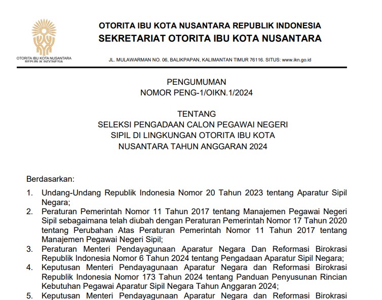 Link akses berkas pengumuman: https://www.ikn.go.id/storage/news/20240820-peng.001-seleksi-pengadaan-calon-pegawai-negeri-sipil-di-lingkungan-otorita-ibu-kota-nusantara-tahun-anggaran-2024.pdf
